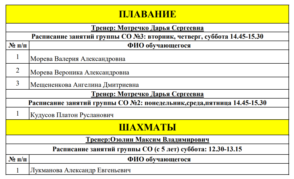 Список обучающихся зачисленных на платные групповые занятия по плаванию и шахматам с 1 апреля по 30 июня