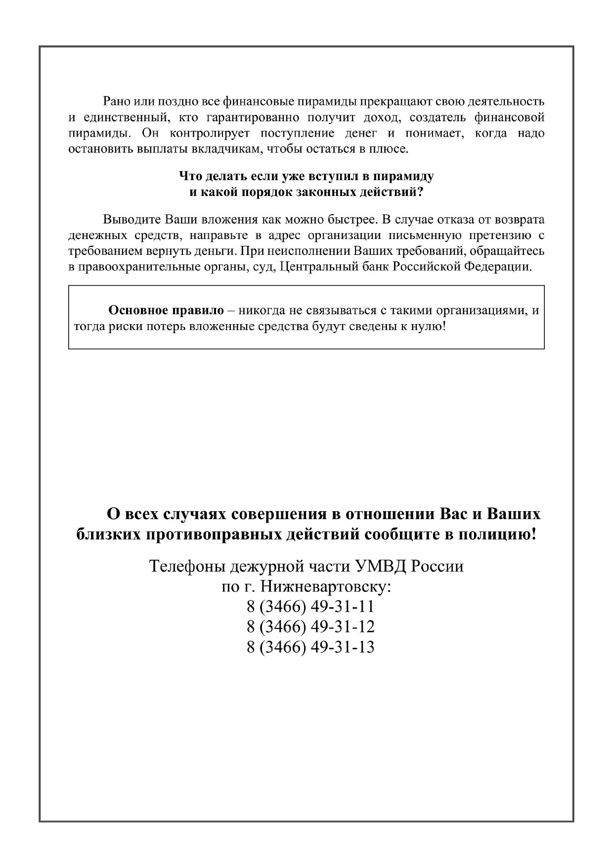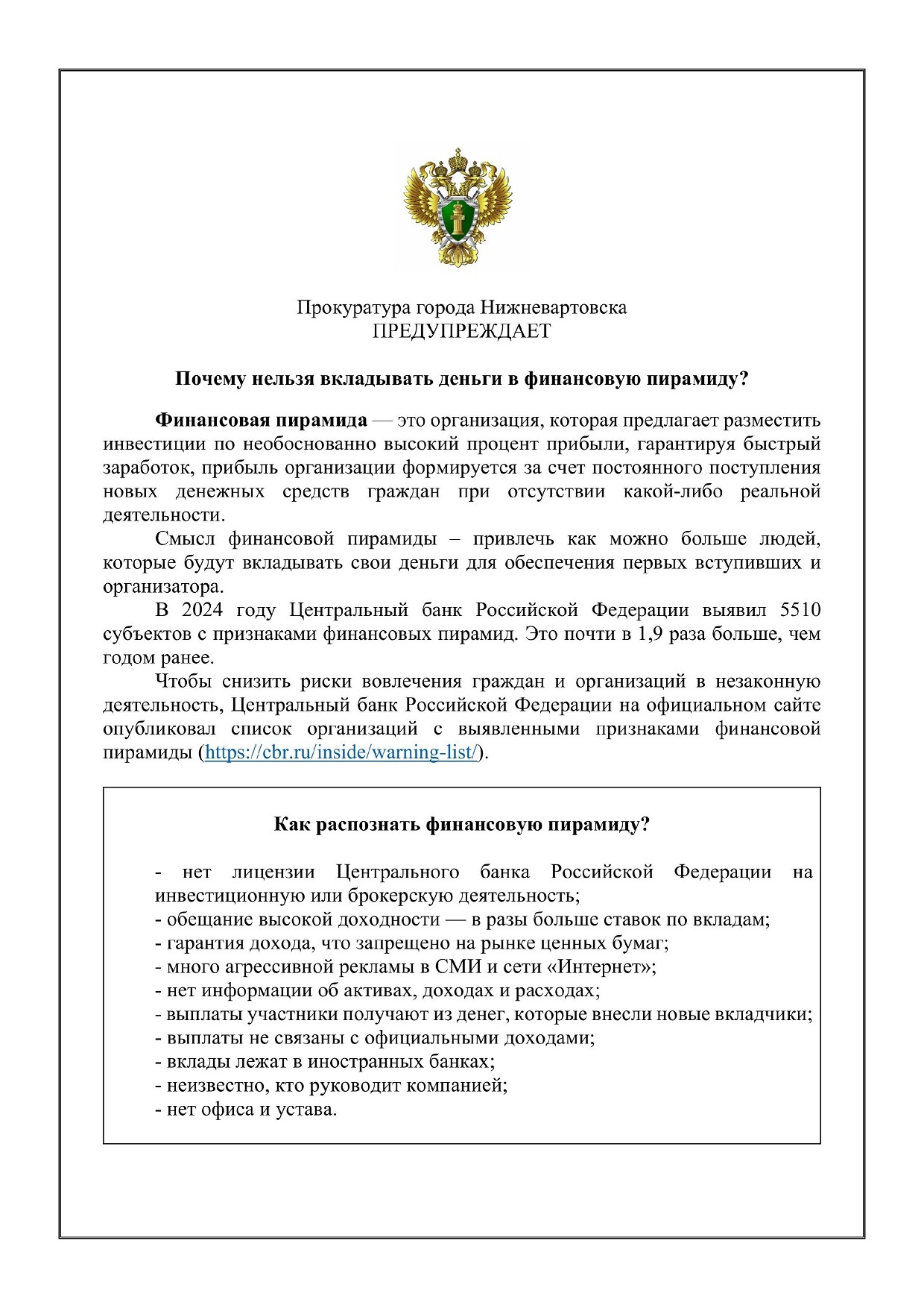 Прокуратура города Нижневартовска предлагает горожанам к прочтению информационный материал по теме: «Почему нельзя вкладывать деньги в финансовую пирамиду?».