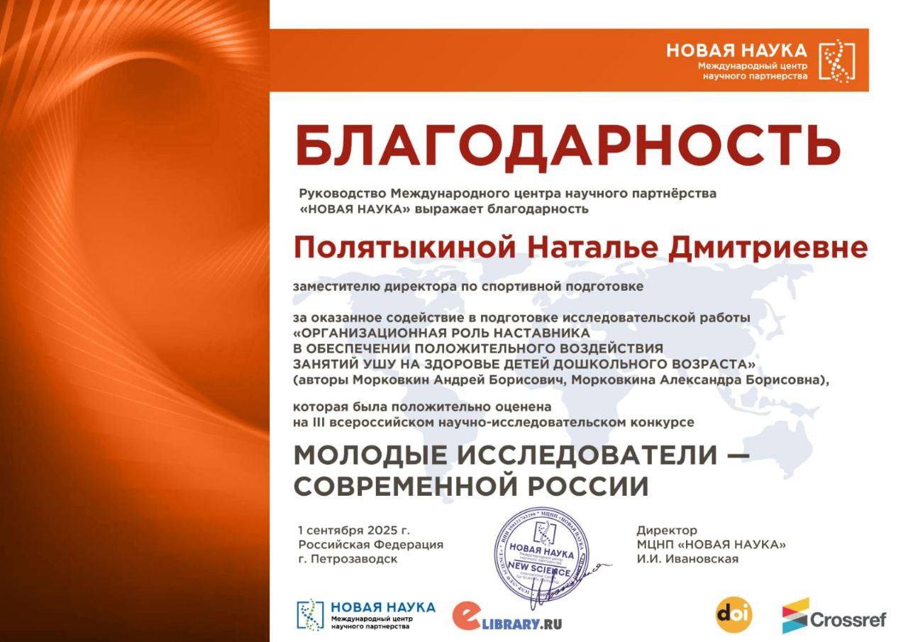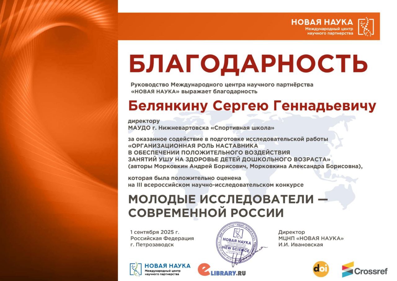 Благодарностью руководства Международного центра научного партнерства "Новая наука" за оказанное содействие в подготовке исследовательской работы авторов Андрея Борисовича и Александры Борисовны, которая была положительно оценена на III Всероссийском научно-исследовательском конкурсе, поощрены директор МАУДО г.Нижневартовска "СШ" Белянкин Сергей Геннадьевич и заместитель директора по спортивной подготовке Полятыкина Наталья Дмитриевна.