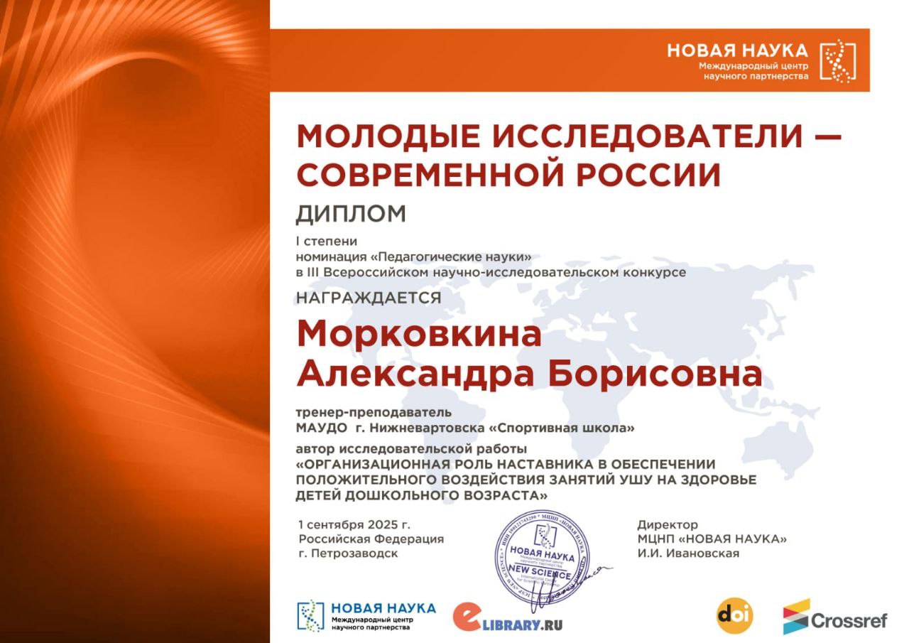 Морковкин Андрей Борисович и Морковкина Александра Борисовна, тренеры-преподаватели по ушу, успешно представили свою научную работу на престижном III Всероссийском научно-исследовательском конкурсе «Молодые исследователи – современной России». Их работа «Организационная роль наставника в обеспечении положительного воздействия занятий ушу на здоровье детей дошкольного возраста» было высоко оценено жюри и заняло первое место в номинации «Педагогические науки».