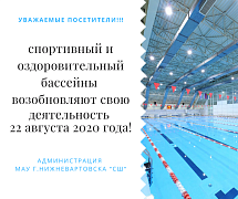 Уважаемые посетители! Мы рады вам сообщить, что бассейны (спортивный, оздоровительный) спорткомплекса "Олимпия" (ул. Чапаева, 22) возобновляют свою деятельность 22 августа 2020 года!