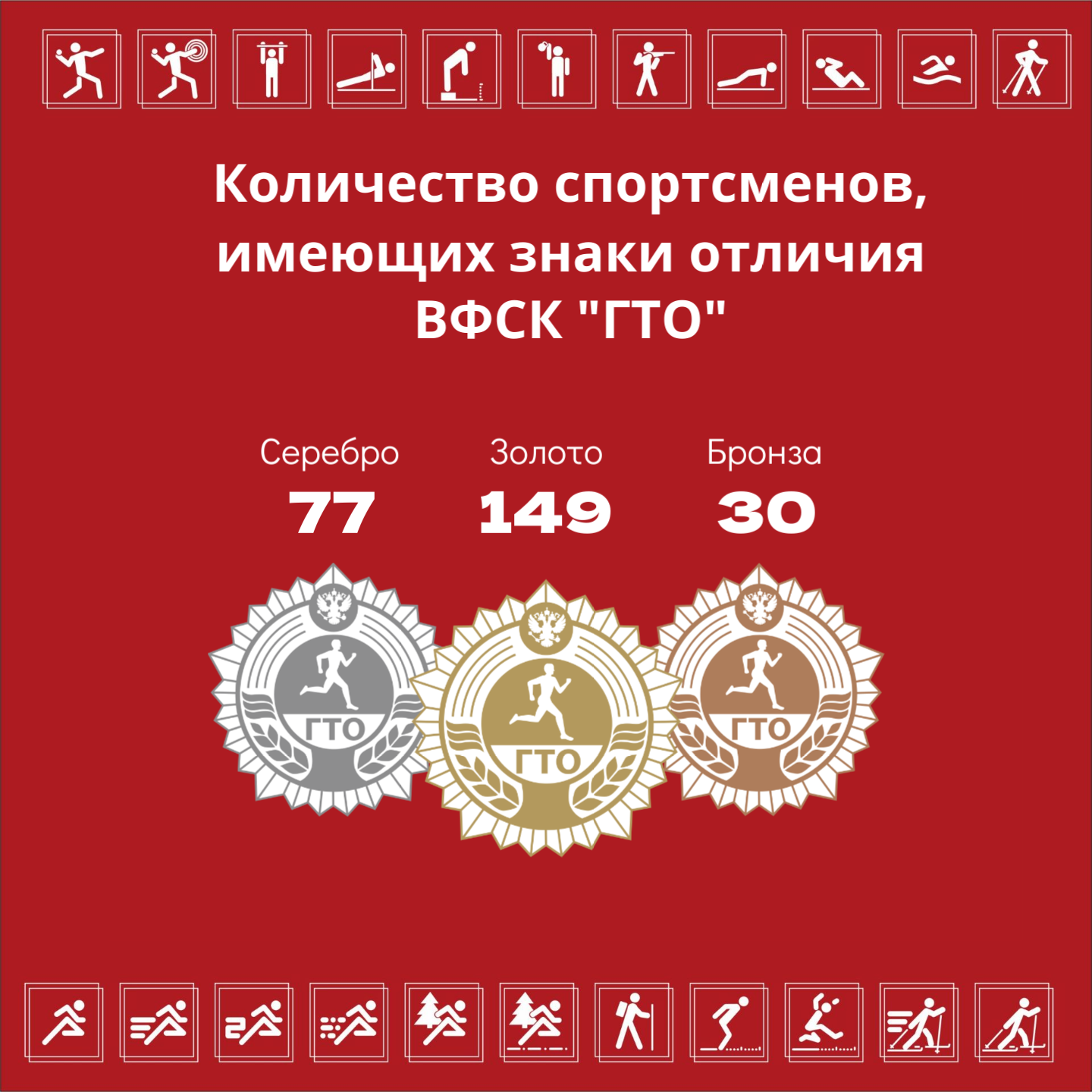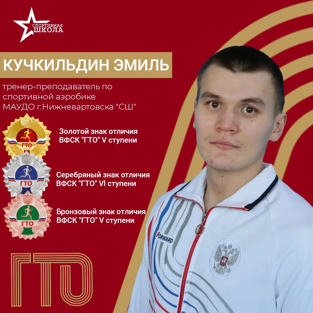 Количество спортсменов, имеющих знаки отличия ВФСК "ГТО", по состоянию на 01.01.2026: Адаптивная физическая культура и спорт - 10 золотых и 2 бронзовых знаков отличия Киокусинкай - 5 золотых, 8 серебряных, 2 бронзовых знаков отличия Кикбоксинг - 2 золотых, 3 серебряных, 1 бронзовый знак отличия Пауэрлифтинг - 1 золотой знак отличия Северное многоборье - 7 золотых, 6 серебряных, 5 бронзовых знаков отличия Смешанное боевое единоборство (ММА) - 6 золотых, 2 серебряных, 1 бронзовый знак отличия Спортивная акробатика - 35 золотых, 20 серебряных, 5 бронзовых знаков отличия Спортивная аэробика - 39 золотых, 14 серебряных, 5 бронзовых знаков отличия Спортивный туризм - 1 золотой, 3 серебряных, 2 бронзовых знаков отличия Танцевальный спорт - 11 золотых, 1 серебряный, 1 бронзовый знак отличия Ушу - 24 золотых, 18 серебряных, 4 бронзовых знаков отличия Шахматы - 8 золотых, 2 серебряных, 2 бронзовых знака отличия. |